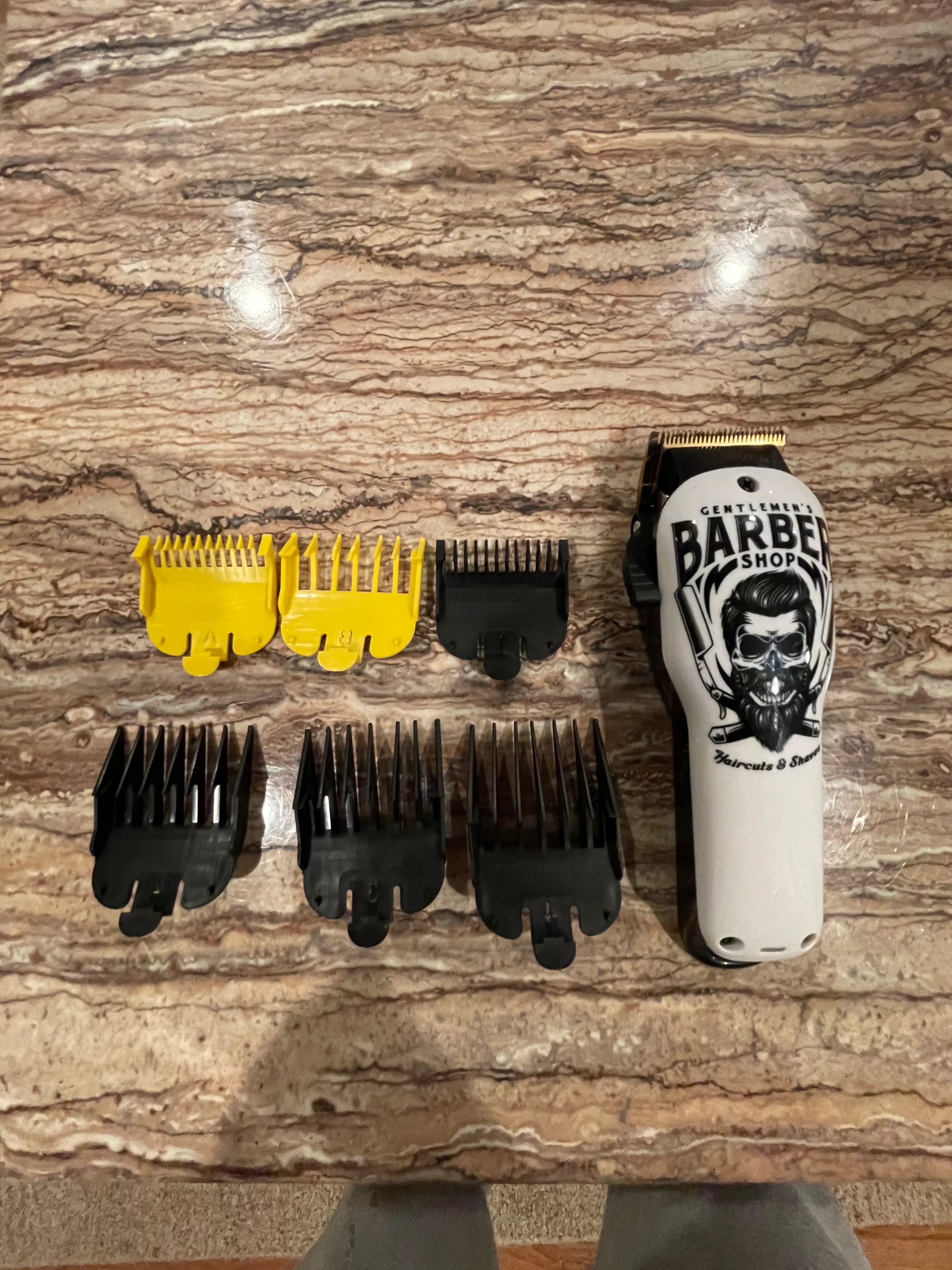 Stand out with a bold skull pattern and Gentlemen’s Barber Shop branding, offering a unique and stylish touch to your grooming tools.